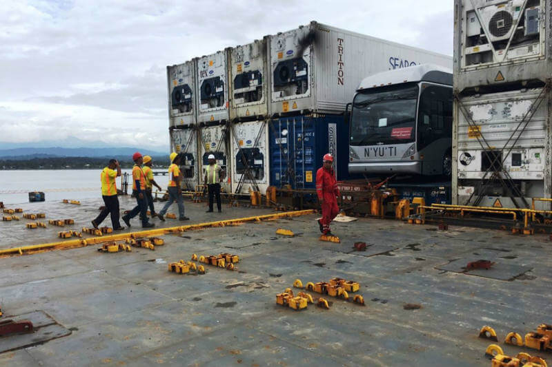 El autobús ingresó por Puerto Limón, proveniente de la planta de pruebas de US Hybrid Corporation, en Windsor, al sur de Connecticut, EE. UU. y será trasladado a las instalaciones de Ad Astra Rocket donde se le practicarán pruebas adicionales y protocolos de integración.