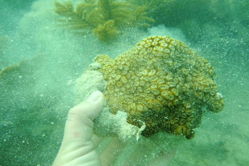 Uno de los impactos de los huracanes es que mueven los sedimentos alrededor. Uno de ellos es que el sedimento que se levanta desde el fondo puede causar un efecto dañino y de limpieza. La parte dañina es que básicamente se crea un chorro de arena que lastima el arrecife, pero también tiende a romper algunas de las algas que crecen excesivamente en el arrecife y que está compitiendo con el coral por el espacio.