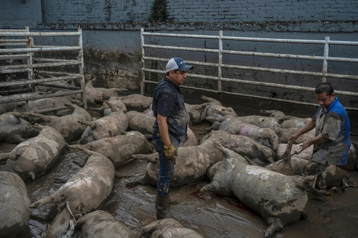 • Trabajadores retiran cerdos ahogados tras las lluvias intensas. – Foto Felix Marquez/AP