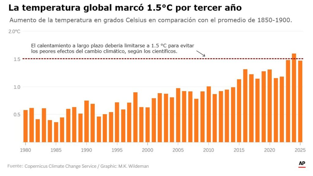 “El hecho de que las temperaturas de 2025 estén tan cerca de los máximos de 2024 y 2023 indica que la Tierra continúa acumulando calor”, explicó uno de los científicos involucrados en la medición global de temperaturas. La causa principal, advierten los expertos, sigue siendo la acumulación de gases de efecto invernadero producidos por actividades humanas, especialmente la quema de combustibles fósiles como petróleo, gas y carbón.